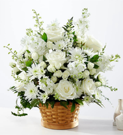 An elegant all-white arrangement featuring fresh white roses, chrysanthemums, and delicate seasonal blooms, beautifully arranged in a classic woven basket. The clean white palette symbolizes peace, grace, and sincerity, while the lush greenery adds natural freshness and depth.